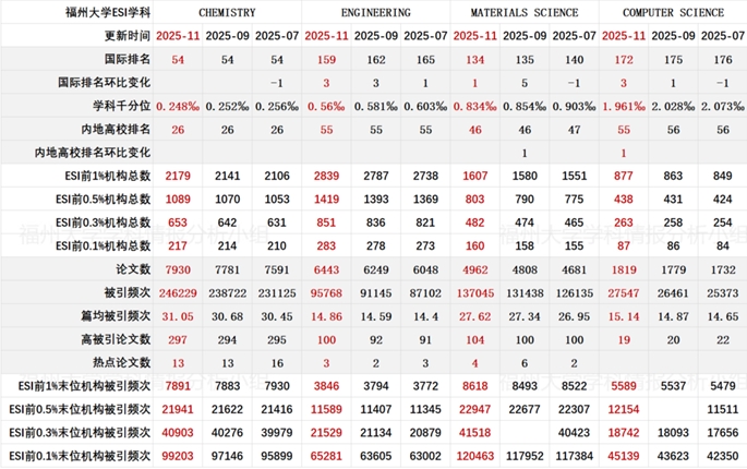 本期ESI数据显示,进入前1%的机构总数为10158,福州大学世界综合排名492位(与上一期数据相比,前进了4位),所处千分位为0.484‰,内地高校排名61位(与上一期数据持平)。福州大学论文总数为29706篇,总被引频次为634722次,篇均被引频次为21.37次/篇,高被引论文667篇(与上一期数据相比,增加了27篇)。福州大学有13个学科进入ESI全球前1%,分别是:化学、工程学、材料科学、计算机科学、农业科学、环境科学与生态学、临床医学、物理学、地球科学、社会科学总论、药理学与毒理学、生物学与生物化学和数学;有三个ESI全球前1‰学科,分别是化学、工程学和材料科学学。数学学科首次进入ESI全球前1%行列!目前,福州大学入选ESI全球前1‰和1%的学科数均居福建省属高校第一。详见表 1。