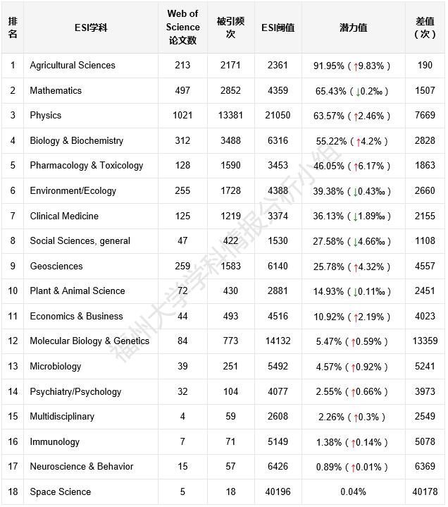 福州大学ESI潜力学科中,本期潜力值最高的是农业科学学科,达到91.95%,其次是数学,排名第三是物理学,详见表2。