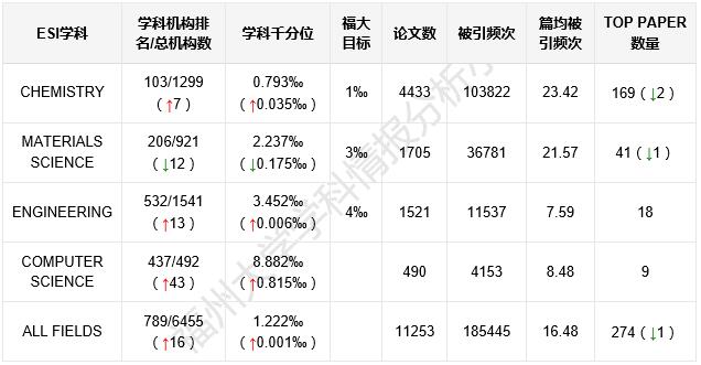 本期ESI数据显示,进入前1%的机构总数为6455,福州大学世界综合排名789位(与上一期数据相比,前进了16位),所处千分位为1.222‰,内地高校排名50位。福州大学论文总数为11253篇,总被引频次为185445次,篇均被引频次为16.48次/篇,高水平论文275篇(与上一期数据相比,减少了1篇)。福州大学有4个学科进入ESI前1%,分别是:化学、材料科学、工程学、计算机科学,详见表1。 表1 福州大学ESI学科情况